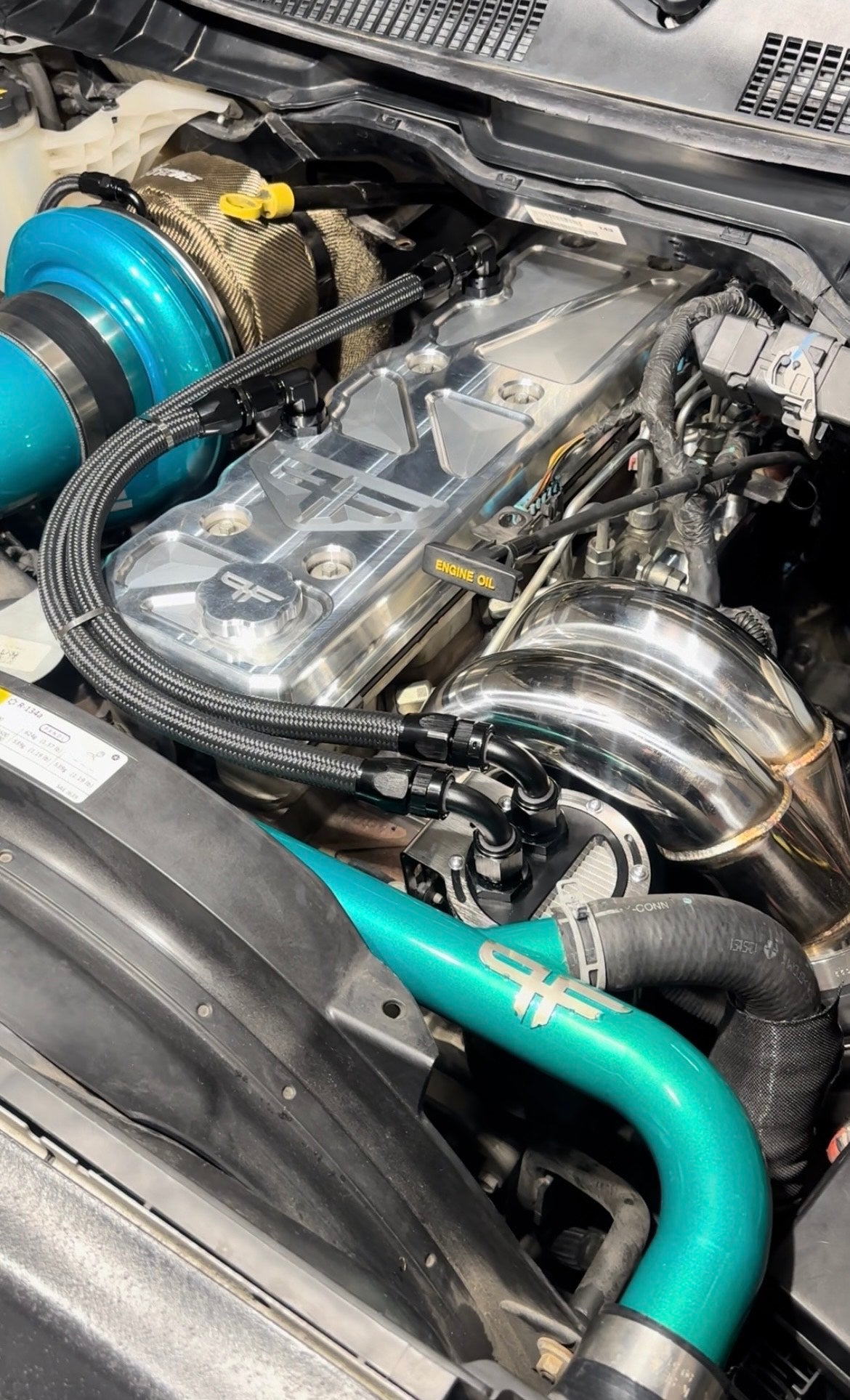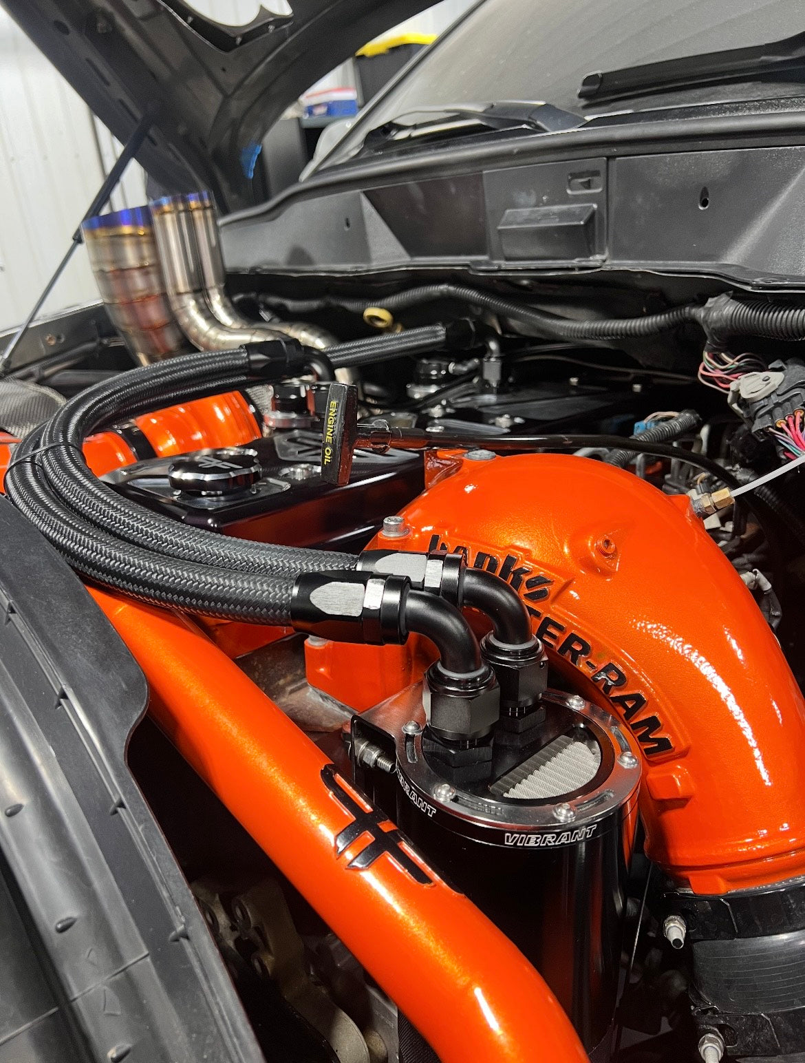 Comes with (2) -12 orb fittings for valve cover, (2) pre made -12 an lines, vibrant catch can, mounting bracket, and stainless hardware to install.